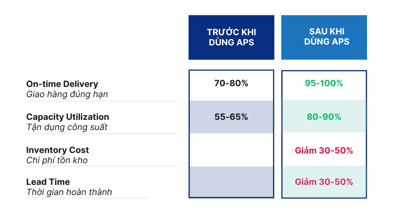 Tỷ lệ giao hàng đúng hạn và mức độ khai thác công suất tăng lên đáng kể, giúp giảm quá tải cục bộ và nhàn rỗi máy móc. Đồng thời, chi phí tồn kho và thời gian sản xuất được rút ngắn, góp phần giải phóng vốn và tối ưu chi phí vận hành.